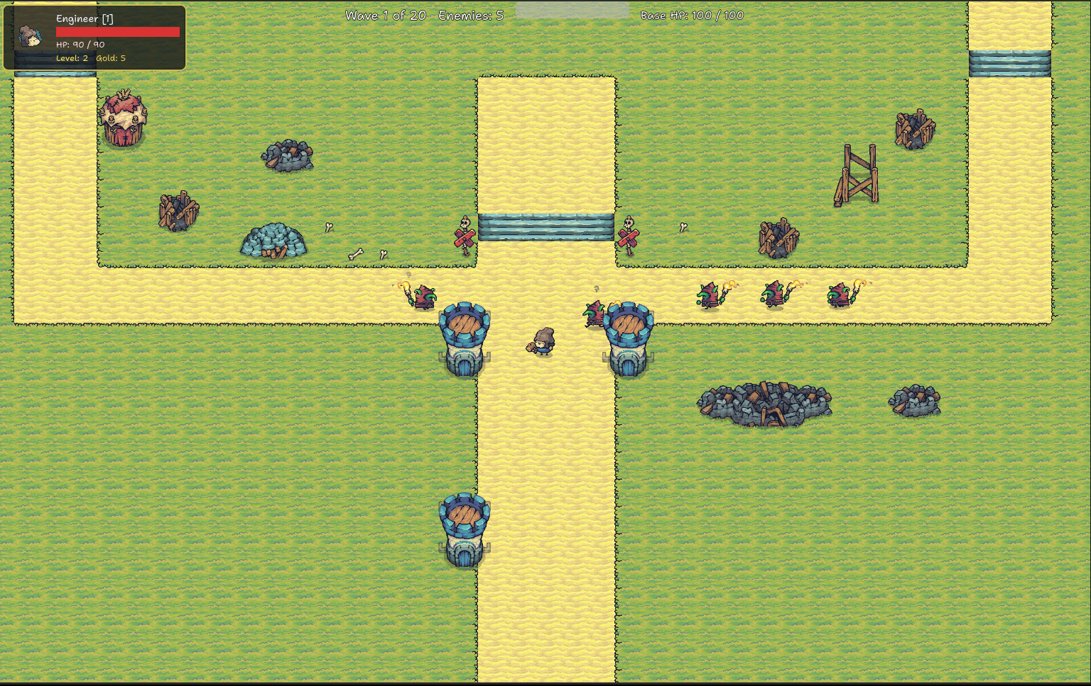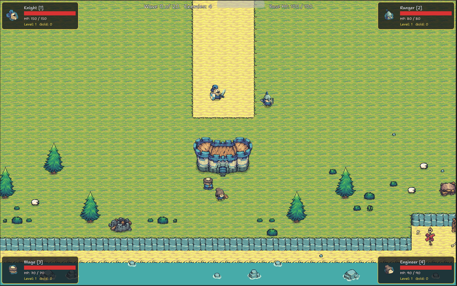 4 classes: Knight, Archer, Mage, Engineer (builds towers)